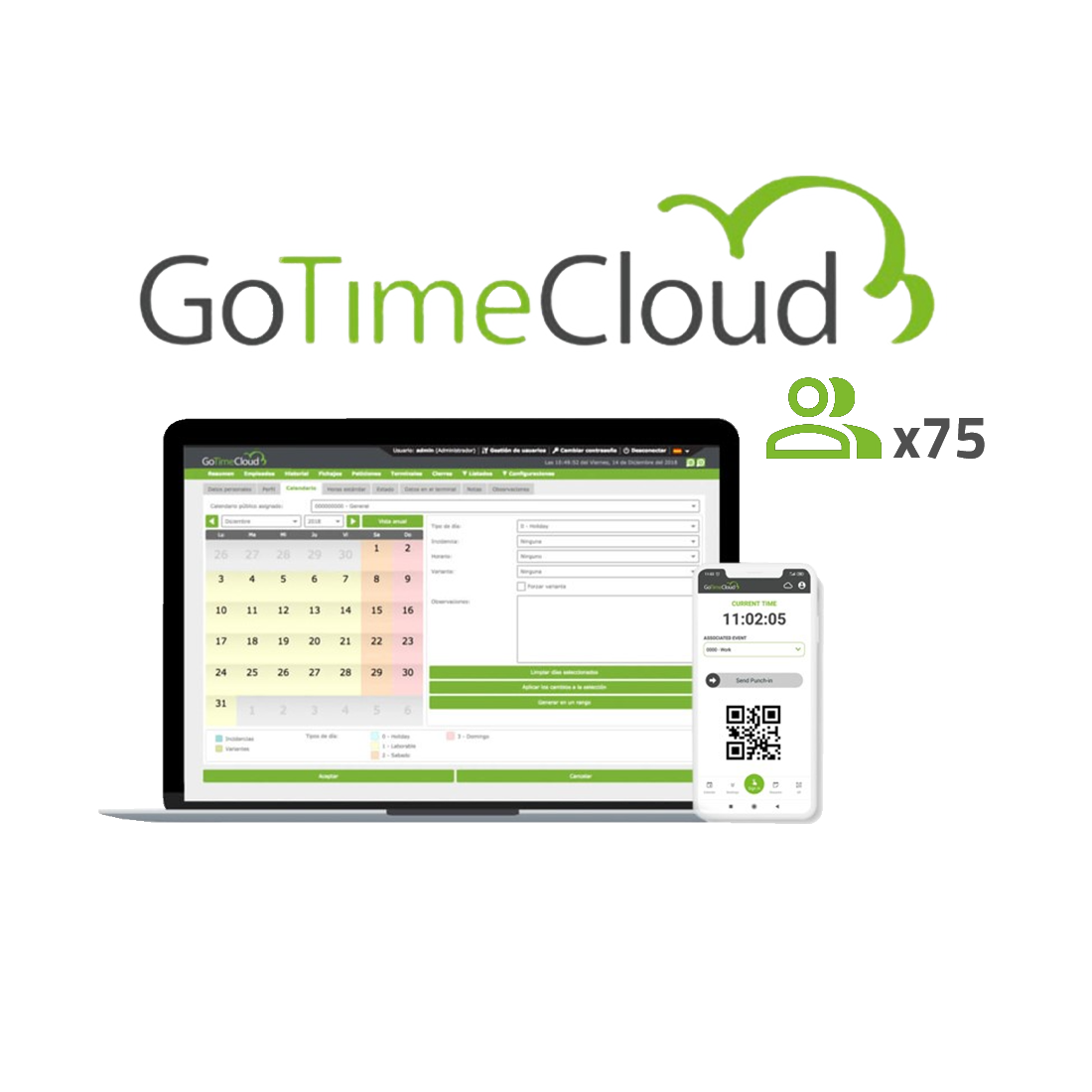 Software control de presencia ZKTeco ZK-GOTIMECLOUD-5 - Licencia nube hasta 75 usuarios y 75 APPs, equipos ilimitados Fichaje remoto con GPS, control de acceso básico opcional TCP/IP y Wi-Fi, acceso web y móvil