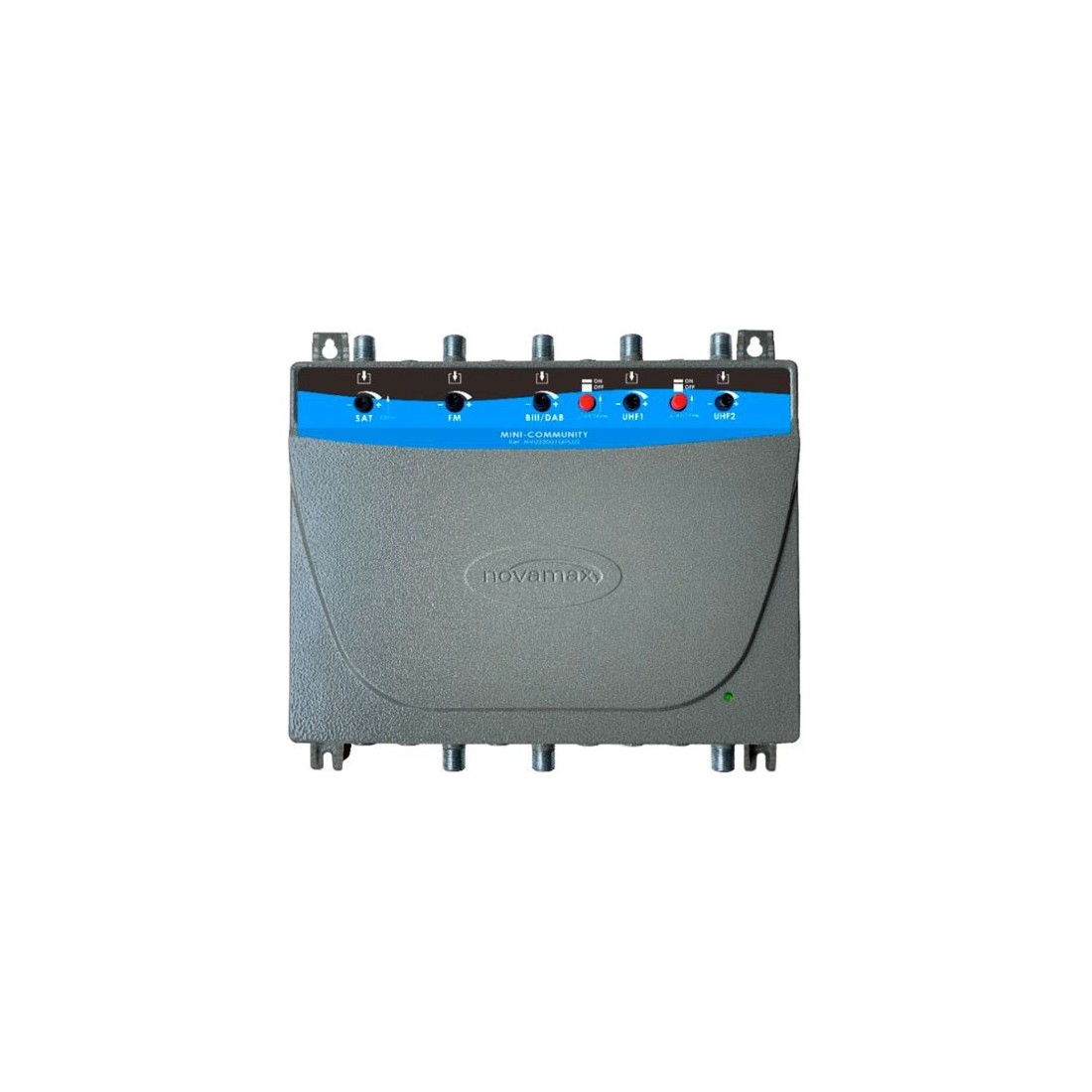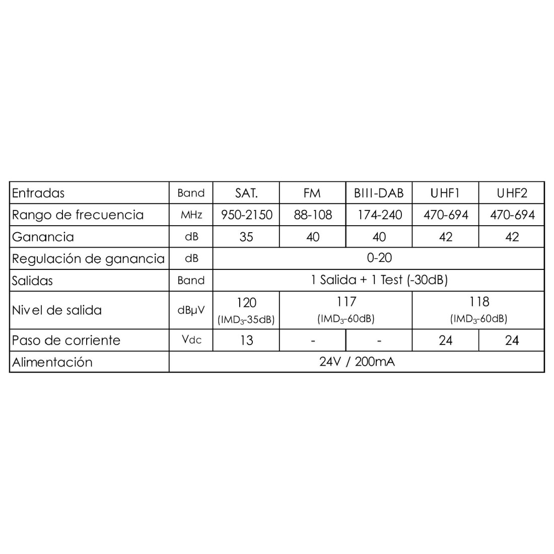 Central multibanda 5E (UHF1 - UHF2- BIII/DAB-FM-SAT) 1Salida + 1 Test (-30dB). Carcasa en ZAMAK . 35/42dB, (42,42,40,40,35dB)