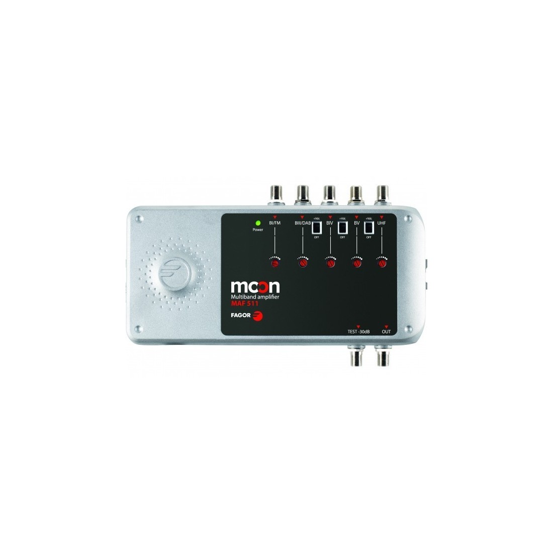 Amplificador Multibanda 5E (UHF1-UHF2-BIII/DAB-BI/FM-SAT) 1 Salida + 1 Salida de Test. 5G. 35/42dB, 116d-118dBuV