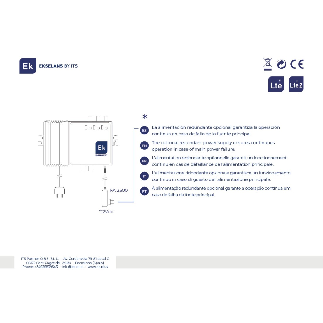 Fabricado por Ekselans, está pensado para instalaciones colectivas o cabeceras modulares, ofreciendo baja figura de ruido y elevada estabilidad de señal. Incluye fuente de alimentación conmutada 100–240 V AC y salida de test -30 dB. Consulta más detalles en la web oficial de EK o visita nuestra sección amplificadores de banda ancha.