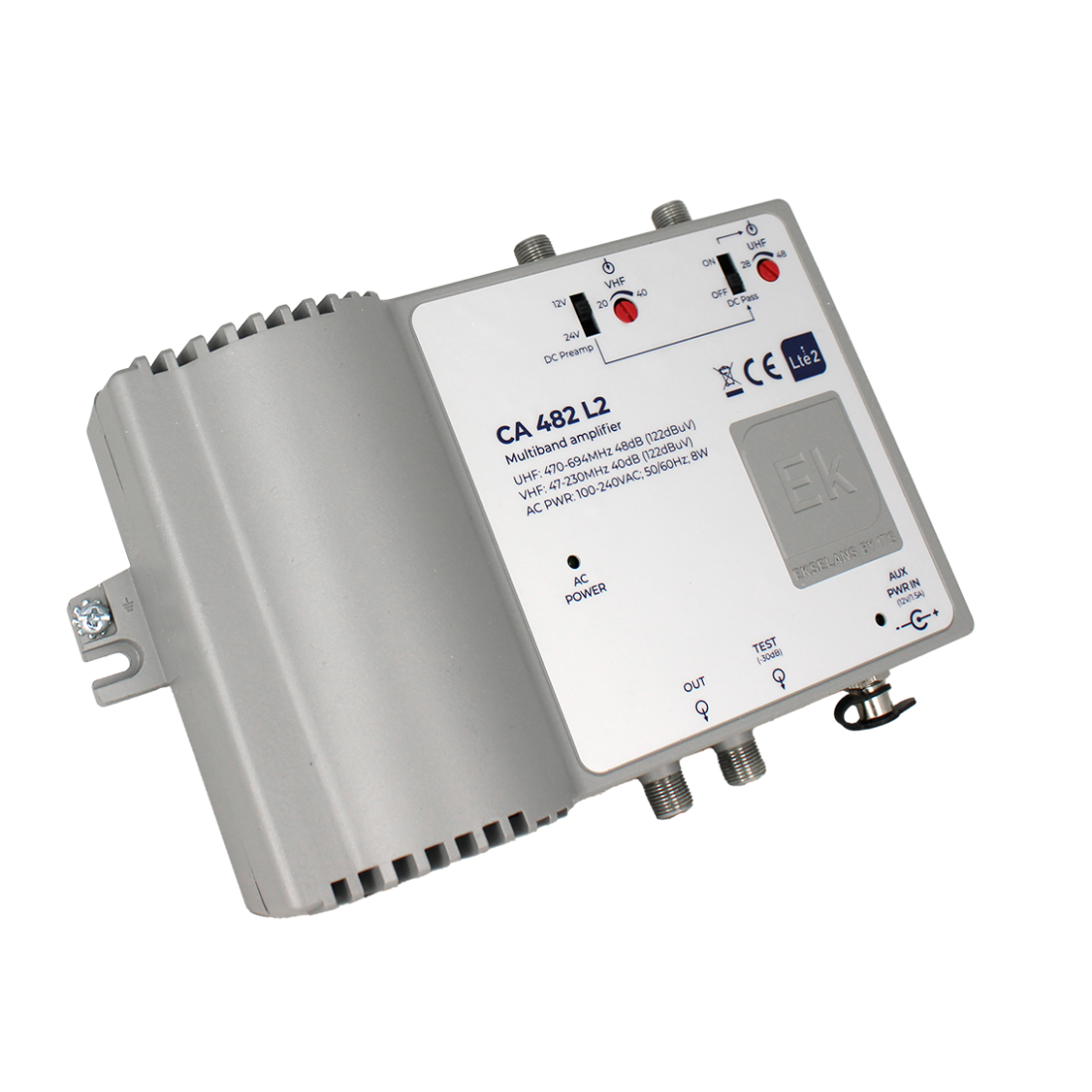 El amplificador de cabecera EK CA482 L2 es un equipo profesional diseñado para sistemas de recepción terrestre de TV digital y analógica. Ofrece 2 entradas independientes VHF y UHF con alta ganancia de 40/48 dB y nivel máximo de salida de 122 dBµV. Incorpora control de ganancia de 20 dB por entrada y paso de corriente seleccionable de 12 o 24 V DC.