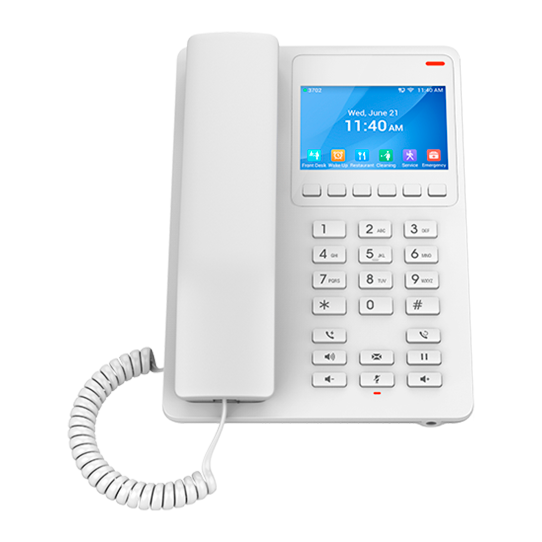 Teléfono IP Grandstream GHP630W Teléfono IP para entornos hoteleros Pantalla LCD color 3.5" 480x320 2 cuentas SIP y 2 líneas WiFi 6 doble banda 2.4 GHz y 5 GHz integrado 1 puerto Ethernet 10/100 Mbps con PoE 10 teclas de marcación rápida y 6 teclas programables Conferencia de 3 vías y audio HD Puerto USB-C para carga Alimentación PoE o adaptador DC Referencia fabricante: GHP630W color blanco