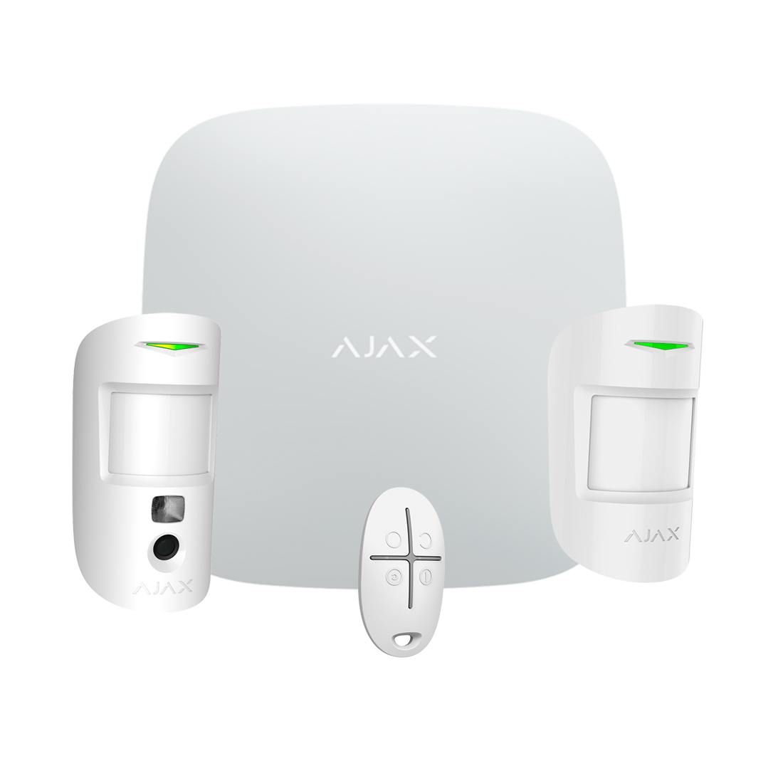 - Kit formado por: AJ-HUB2-W (panel con batería de respaldo), 1 detector de movimiento PIR con cámara AJ-MOTIONCAM-W, 1 detector de movimiento PIR AJ-MOTIONPROTECT-W y 1 control remoto AJ-SPACECONTROL-W