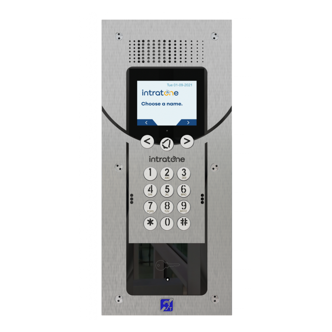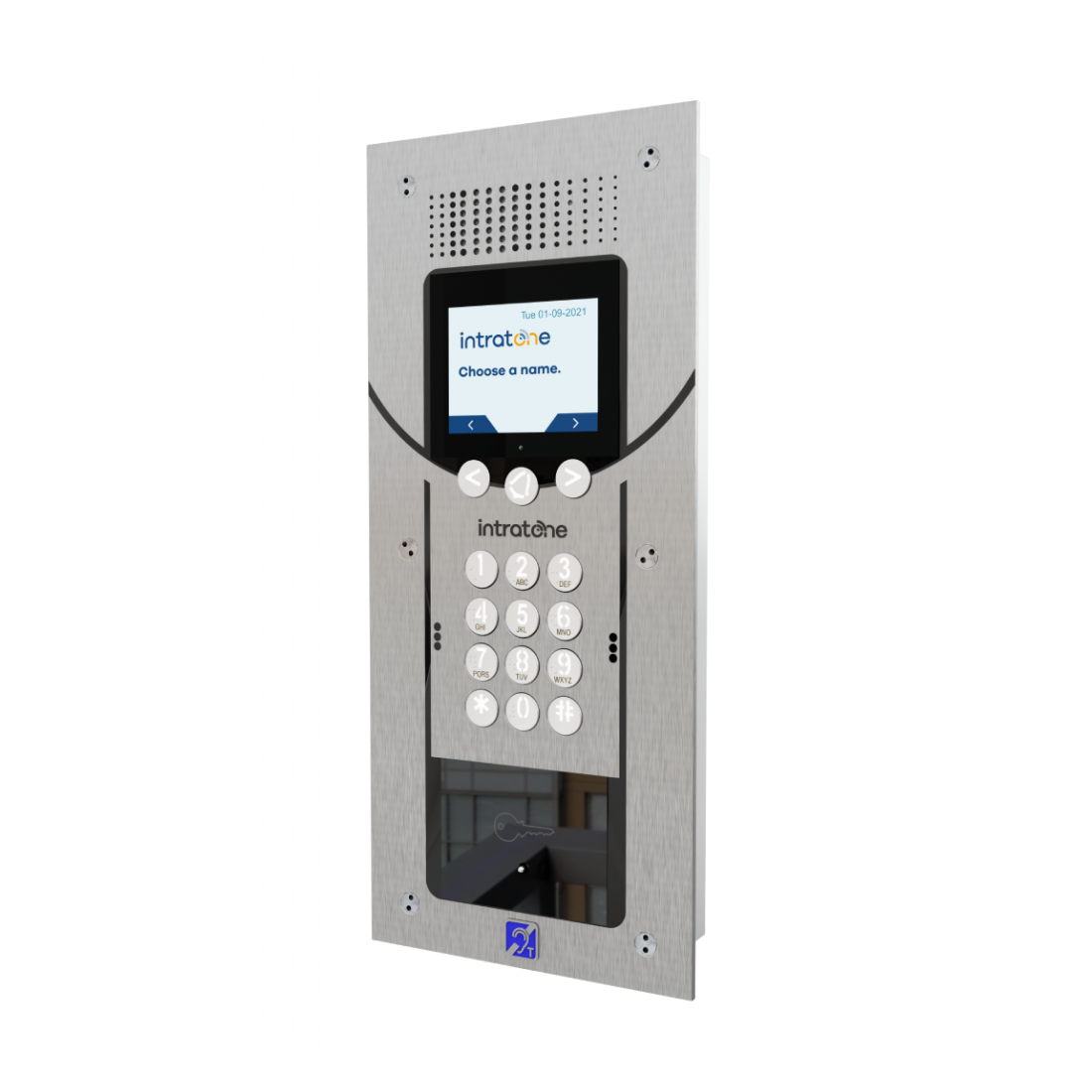 El intercomunicador con pantalla digital se comunica directamente con el teléfono inteligente del residente cuando un visitante toca el timbre.